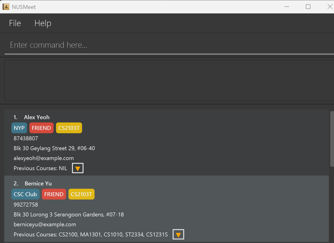 NUSMeet is a desktop application for managing your contact details. While it has a GUI, most of the user interactions happen using a CLI (Command Line Interface).