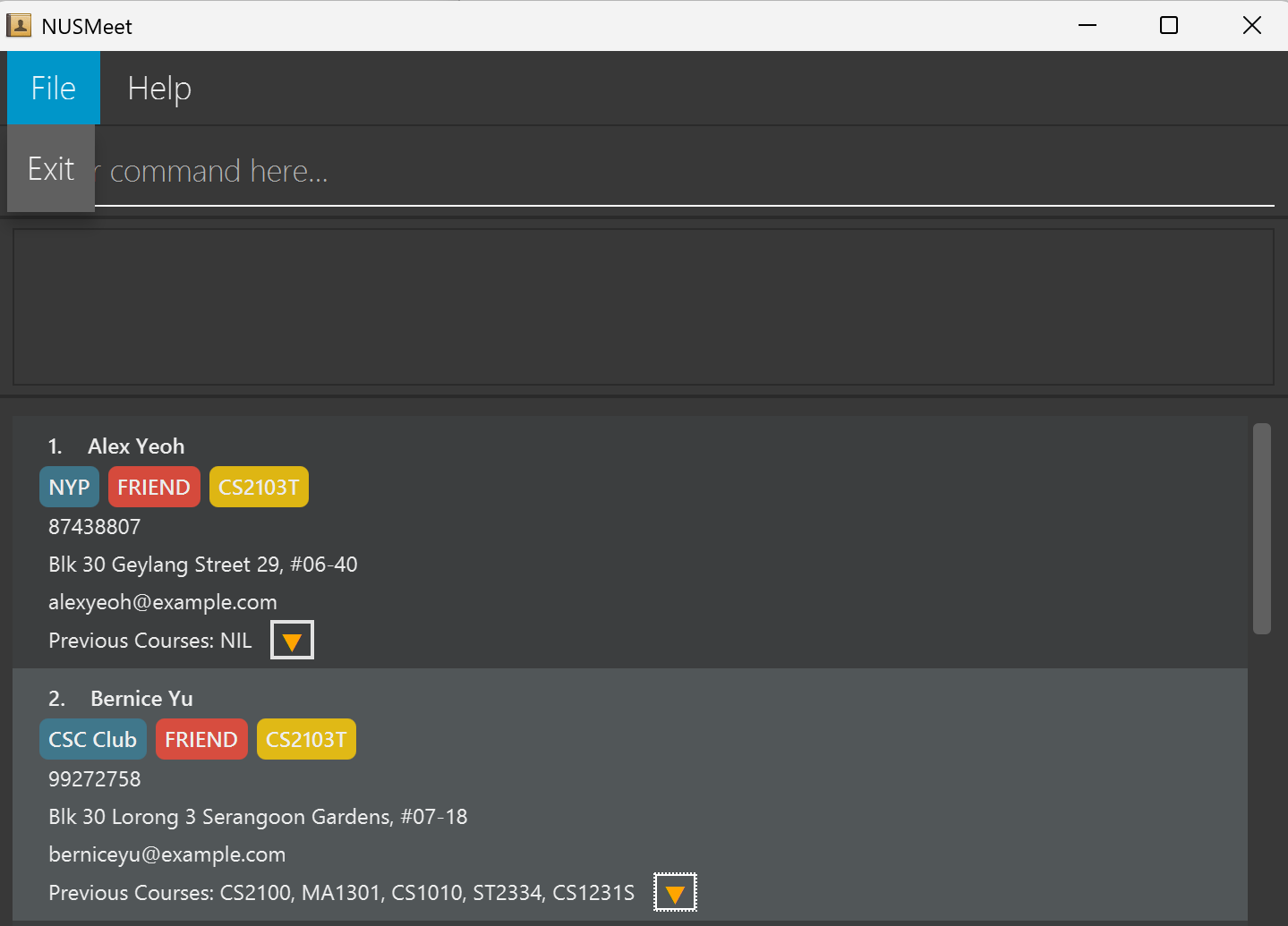 add n/Alexis Yap p/97438807 e/alexis@example.com a/Blk 31 Geylang Street 28, #09-34 c/CS2103T o/CS2100 t/NYP f/FRIEND.add n/David e/david@example.com a/Blk 435 Serangoon North Street 21, #17-23 p/91890901 f/FRIEND.listShows a list of all your friends in your contact book.