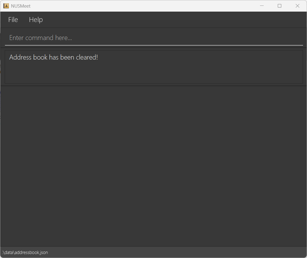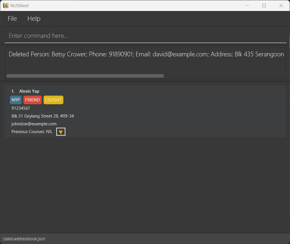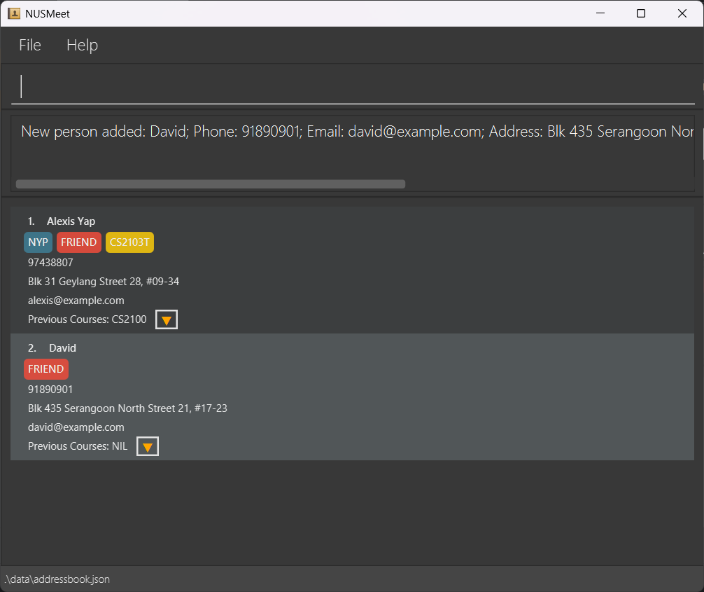 NUSMeet automatically stores your contact as a JSON file at [JAR file location]/data/addressbook.json.