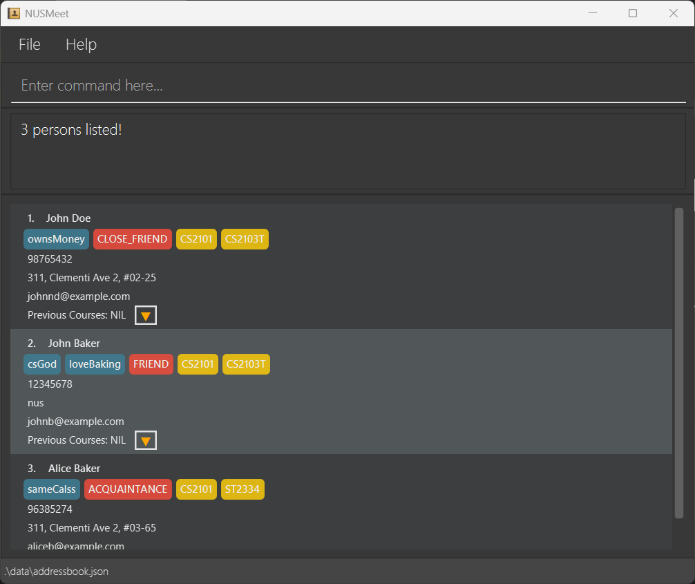 NUSMeet is your go-to Command Line Interface (CLI) application for keeping track of your friends and schoolmates at NUS. No more scrambling to remember who's taking the same module as you β just tag, and find the right people to study with in seconds.