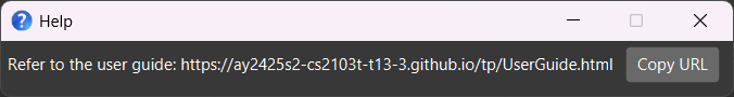 UPPER_CASE are the parameters you should supply!add n/NAME, NAME is a parameter which can be used as add n/John Doe.[ ]n/NAME [t/TAG] can be used as n/John Doe t/NYP or as n/John Doe.β¦ββ¦β after them can be used multiple times including zero times.[c/COURSE]β¦β can be used as c/CS2103T, c/CS2103T c/CS2101 or 0 times etc.n/NAME p/PHONE_NUMBER, p/PHONE_NUMBER n/NAME is also acceptable.help, list, exit and clear) will be ignored.help 123, it will be interpreted as help.helpShows a message explaining how to access the help page.